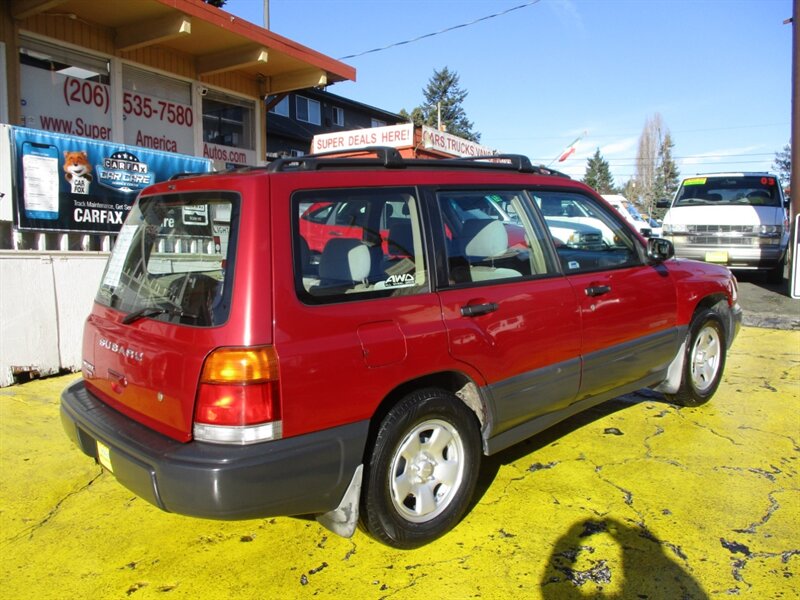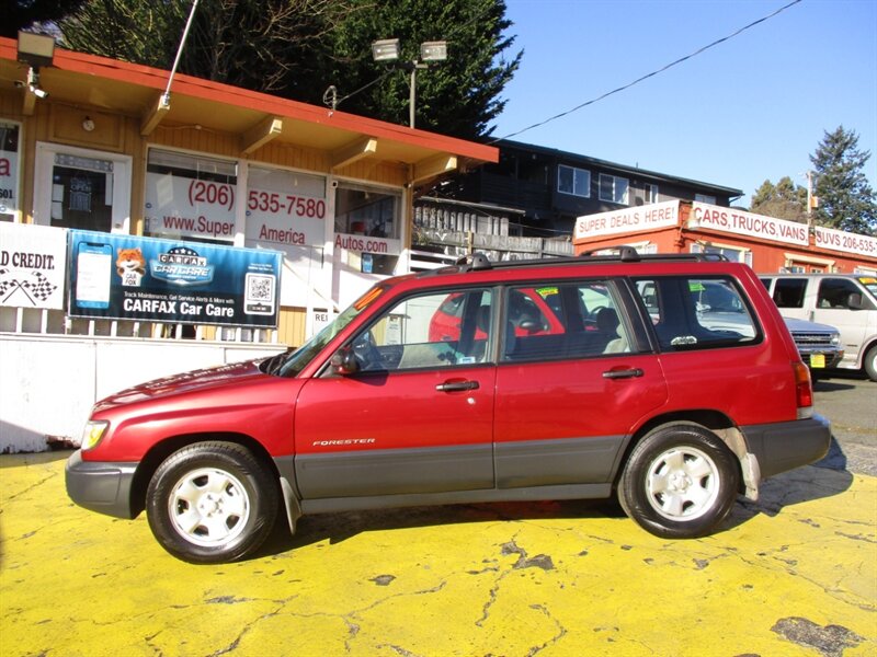 2000 Subaru Forester L — Red exterior with a beige cloth interior. Powered by a 2.0L naturally aspirated H4 SOHC 16-valve engine and Subaru’s Symmetrical All-Wheel Drive, this one-owner vehicle has under 168,000 miles (about 7,000 miles/year), gets approximately 19 MPG city and 25 MPG highway, and is in excellent overall condition with a clean CARFAX.